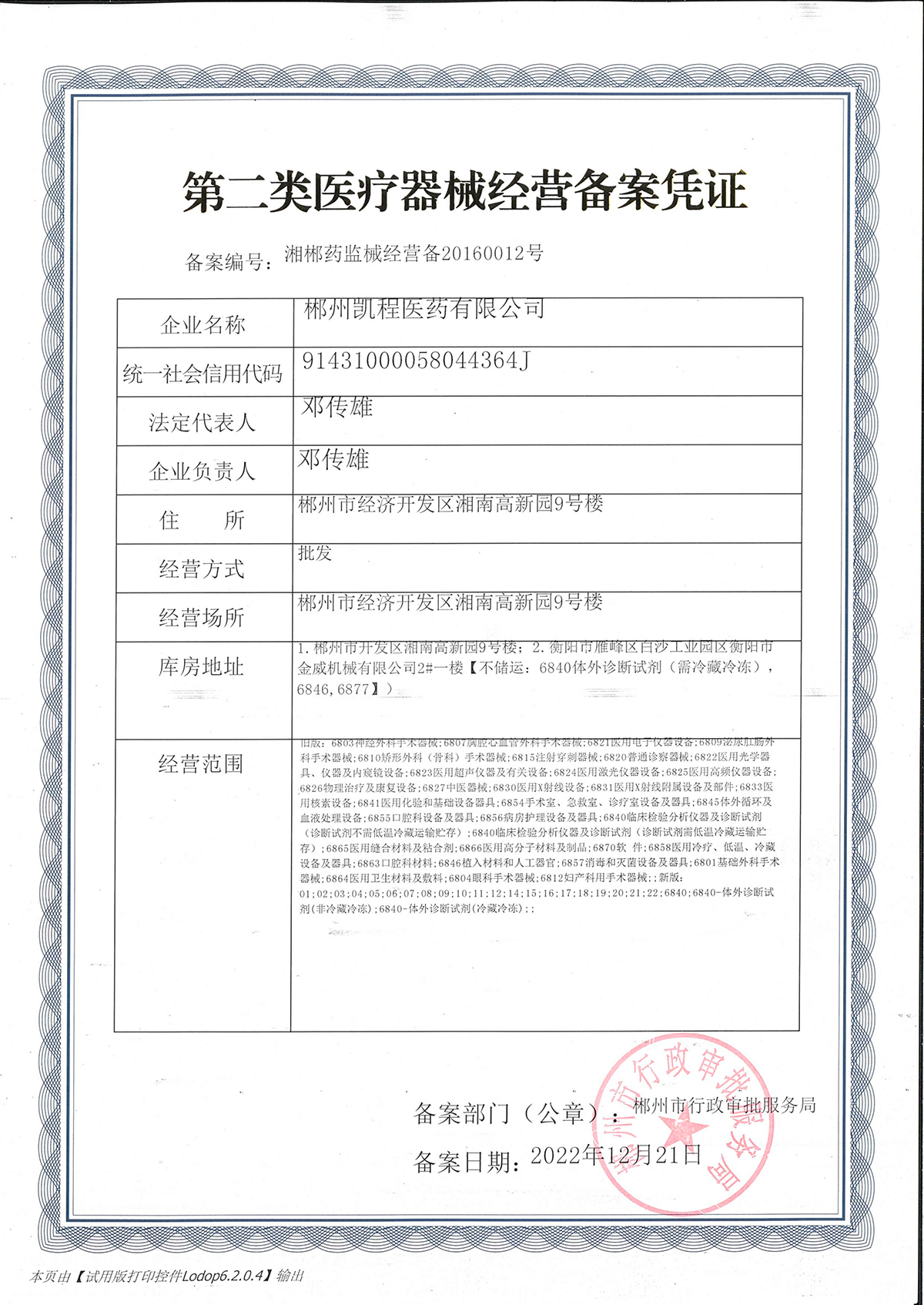 第二類醫(yī)療器械經(jīng)營備案憑證:湘郴藥監(jiān)械經(jīng)營備20160012號(hào)